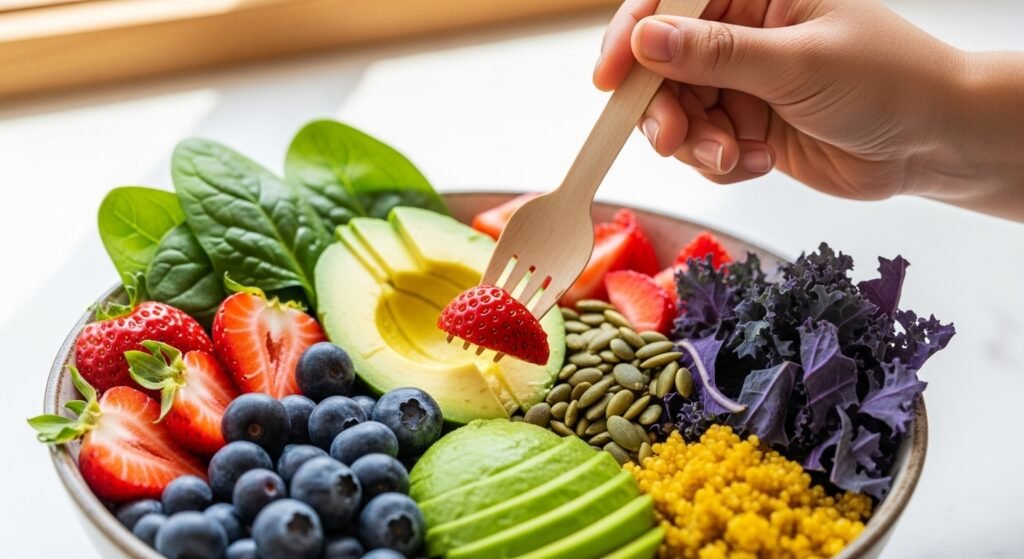 How to do it: Choose fruits, vegetables, nuts, and seeds over processed foods, sugar, and excessive caffeine. Notice how your body feels after eating a vibrant, healthy meal.